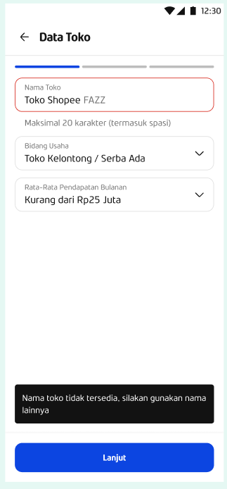 “Nama toko tidak tersedia, silakan gunakan nama lainnya.”